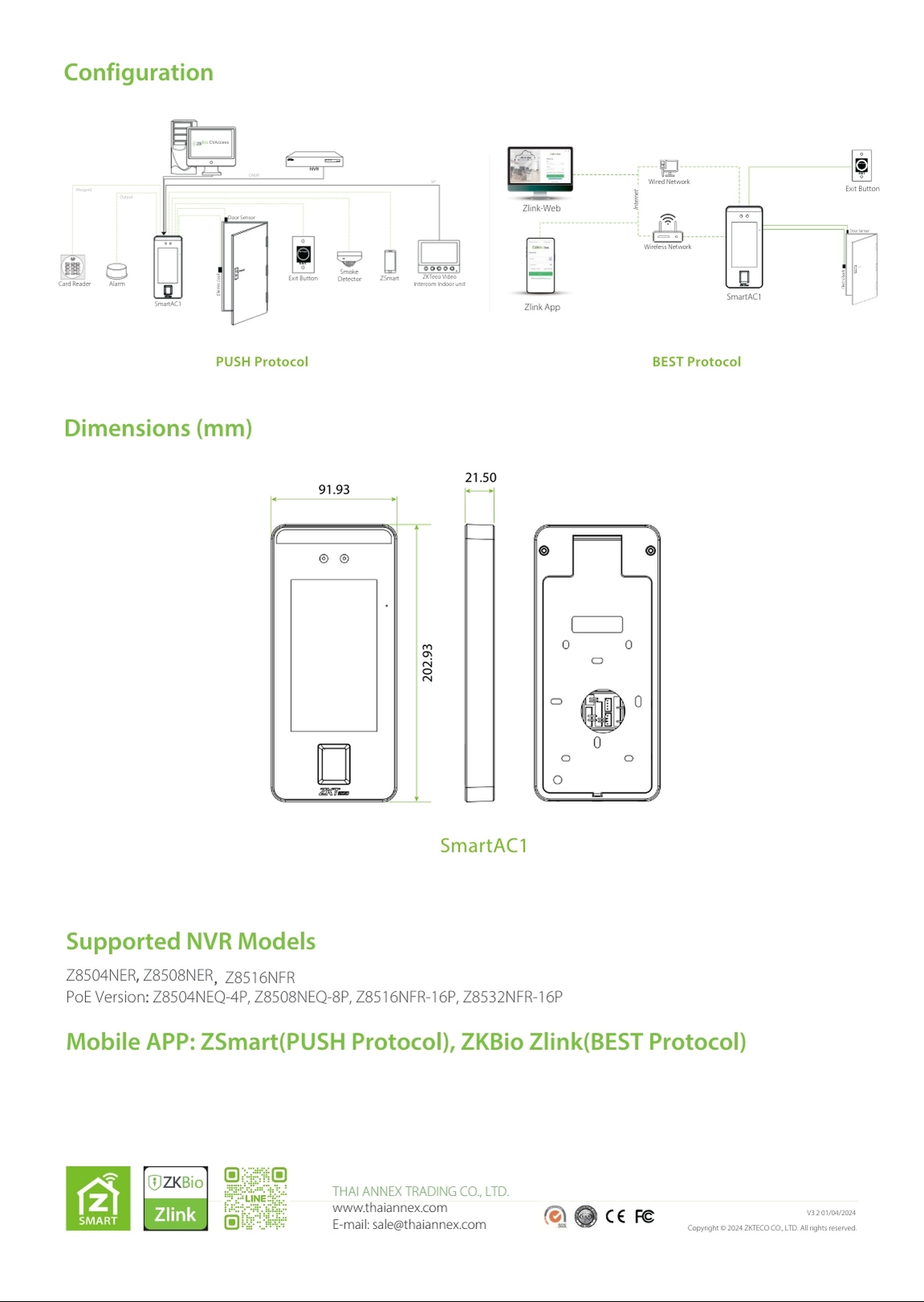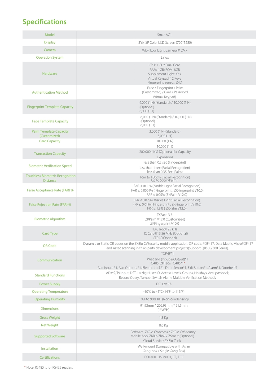 - เชื่อมต่อ TCP/IP, Wiegand Input / Output , RS485, RS232, WIFI